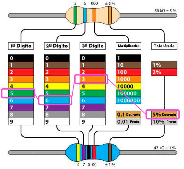 Para os de 5 faixas a primeira, segunda e terneira representam o dígito e a quarta ao multiplicador ou números de zeros, conforme vista na tabela de código de cores.