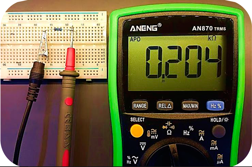 Utilizando multímetro é colocar na escala de resistência e ir mudando o curso do multímetro até chegar numa escala que consiga efetuar alguma leitura no multímetro.