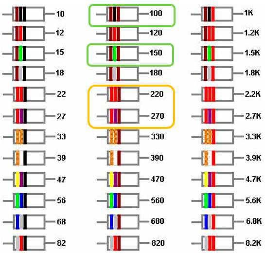 Com esses valores é só comprar um resistor de 250Ω (ohms) com valor de 100mW. Porém, no comércio de componentes você só vai encontrar valores padrões de resistência e potência para os resistores, a seguir temos uma tabela com alguns valores comerciais de resistências dos resistores: